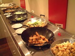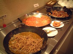 店の前、店内とも鉄鍋バイキングという大きな看板が掲げてあります。 鉄鍋バイキングって鍋料理の食べ放題?よくわからない言葉ですが、 ブッフェコーナーには普通の料理の入った鉄鍋が並び、下からスチームで温めているようです。 料理が冷めない工夫には好感が持てました。 海老イカチリ、酢豚、麻婆豆腐、肉野菜炒め、春巻、焼売などふつーの中華のほか、 挽肉のバジル炒めやグリーンカレーなどタイ風エスニック、サラダ、デザート(ミニケーキ2種、 シュー菓子、グレープフルーツゼリー)などが並んでいます。 残念ながら私達が行った時はお客の途切れ目で他に客は1組しかおらず、 料理は乾いたり伸びたりふやけたりしていました。 ところが私達が入って食べているうちに客が入って来て、満席になり、 ブッフェ台も大混雑、後の客に席を譲って帰ることにしました。 もしかしたらその後なら、出来立ての料理が補充されて少しは美味しかったかも知れないのですが。 |