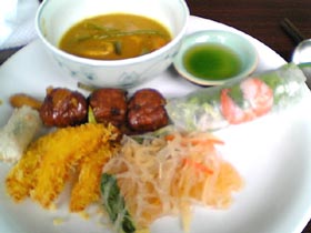 上のレポの10日ほど後にもこの辺でお昼になったので、また寄ってみたのですが、 な、なんで!?品数が1.5倍くらいには多い。 この間のメニューにプラス、生春巻、肉団子もあったし、揚げ物も2種類出てたし、カレーにはちゃんと具も入っている。 なんでだろう?時間帯は同じなのに。これならもちろん満足。 日によって違いすぎだなぁ。 |