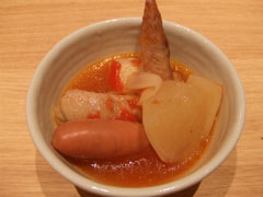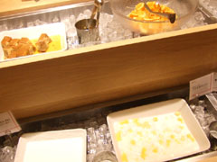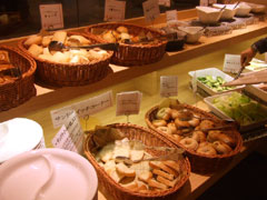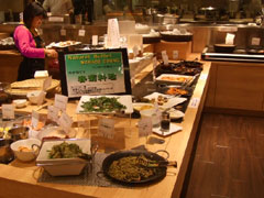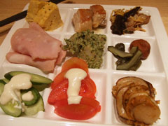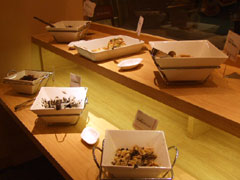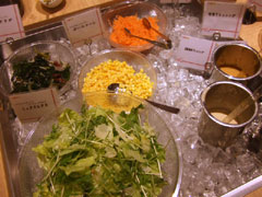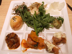 ナチュラルな色調で統一したこぎれいな店内で、野菜がメインの和食の食べ放題です。 客席とブッフェは完全に離れており、ブッフェ台とかブッフェコーナーとかいう よりもうこれは「ブッフェルーム」です。 広すぎるブッフェでは料理の皿と皿のあいだがたっぷりあいていて、「取りやす い」を通りこしてちょっと寂しいくらい。 野菜の常備菜を中心に、温かい料理、パン、デザートが並びます。ドリンクバーはもちろん、 アイスクリームもあります。 野菜を主役にした料理は、味付けもあっさりめでヘルシー。 友人は酒のツマミにならない、と文句を言っていました。 あっさりしたものが食べたい気分の時や、美容と健康のため食事に気をつけているという 方におすすめです。 |